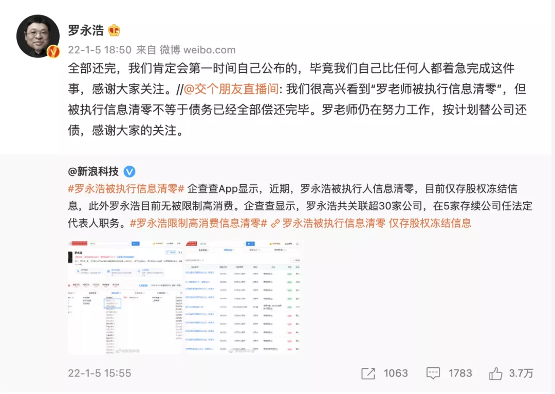 1 月 5 日下午,有媒体曝出:「企查查 App 显示,罗永浩被执行人信息清零,目前仅存股权冻结信息。」
