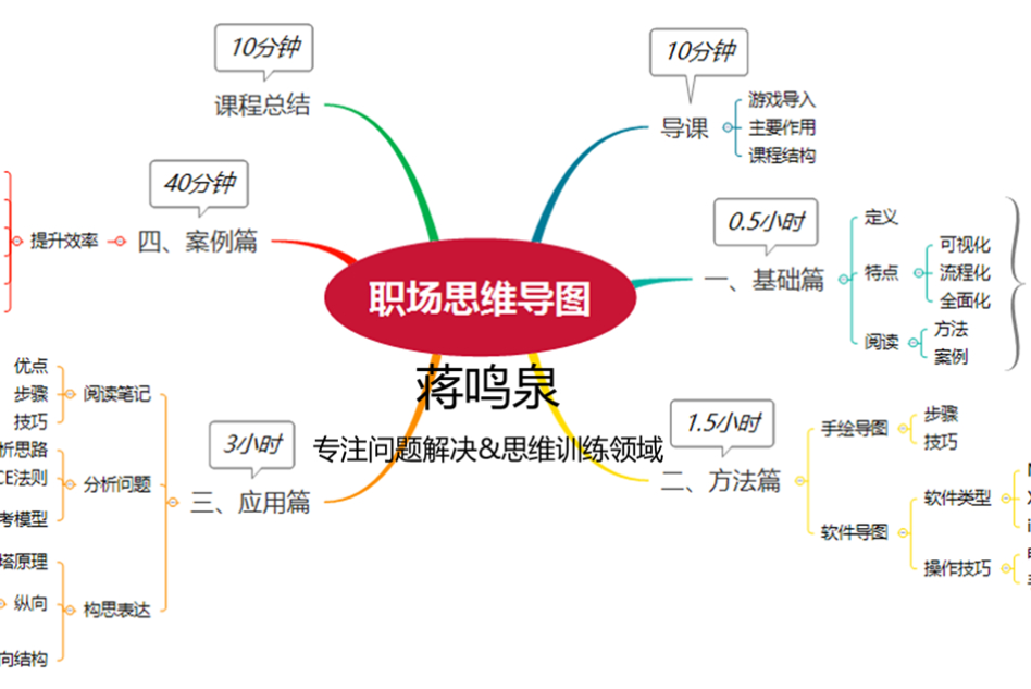 蒋鸣泉老师以运用思维导图提高员工的工作效率为目标,将思维导图在职场的应用与实践作为课程训练的重点,通过思维导图训练以提高学员的思维能力,掌握职场思维导图在工作应用中的各种技能、技巧,从而有效提升工作效率、解决工作中的难题,以真正实现思维导图工具在职场中的价值。
